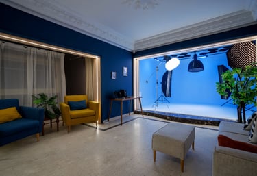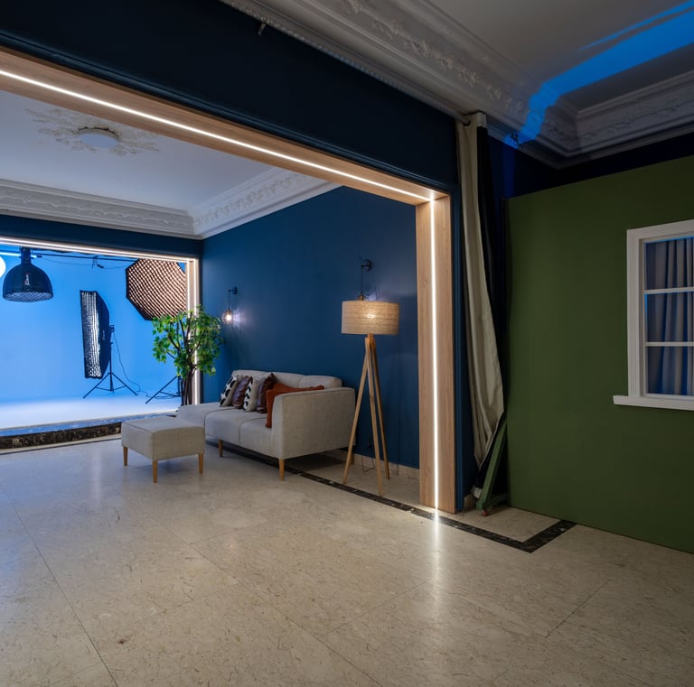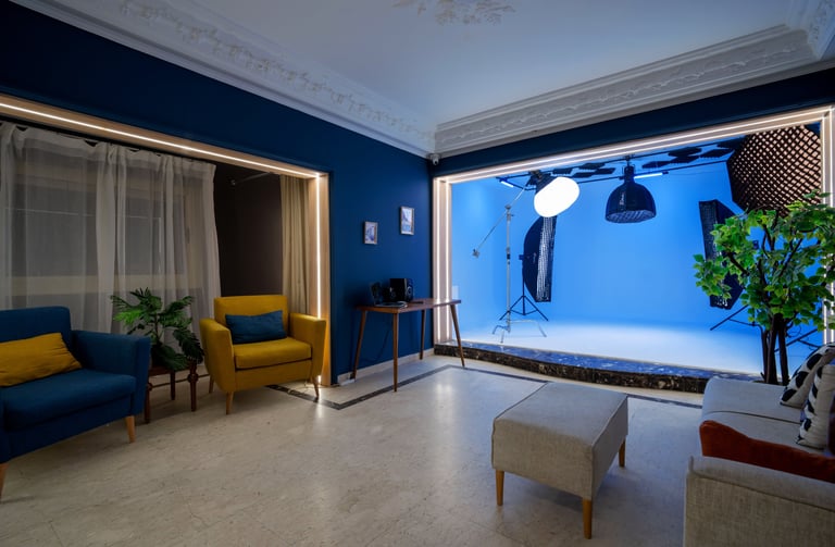A fully equipped Rental photography & videography studio for all photographers & videographers, content creators, advertising campaigns, commercial ads, art seekers has the biggest Cyclorama in town, paper backdrops, living room location, Bedroom location, fully - equipped Kitchen location for food photographers, food stylists, food bloggers, chefs, restaurants reels' content, podcast setups, office location, fake walls, makeup station & fitting room .
